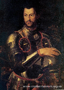 科西莫一世 布龙齐诺风格 16世纪 布面油画 佛罗伦萨,乌菲齐美术馆 著名肖像画家布龙齐诺曾为科西莫一世•德•美第奇(1519-1574年)绘制过一幅极具代表性的肖像。他本人及其画坊曾多次复制该作品。科西莫一世1537年继任第二代佛罗伦萨公爵,1569年成为第一代托斯卡纳大公。他以建立乌菲齐宫闻名于世,而乌菲齐宫后来成为欧洲著名的美术馆。 |