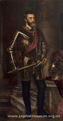 戎装的查理五世 提香•韦切利奥及其画坊 16世纪 布面油画 佛罗伦萨,乌菲齐美术馆 神圣罗马帝国皇帝查理五世(1500-1558年)1548年委托提香绘制了这样一幅身穿铠甲的肖像,之后欧洲贵族们不断向提香和他的工作室要求复制该肖像。科西莫一世•德•美第奇也向提香定制了这幅查理五世肖像和其子菲利普二世(1527-1598年)的肖像,将它们挂在一起,后者现藏于乌菲齐美术馆巴拉丁画廊。提香绘制的原作和其他复制品都已经不存在了,这是唯一存世的一幅。 |