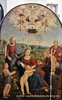 圣家族与圣安娜 多梅尼科•阿尔法尼(佩鲁贾,约1480-1553年后) 1510年 木板混合媒介 佩鲁贾,翁布里亚国家美术馆 这幅画描绘了小耶稣全家,外祖父母和小圣约翰。阿尔法尼依照挚友拉斐尔从罗马寄来的素描,于1510年时绘制了该作品。拉斐尔通过包含比例关系的素描指导阿尔法尼如何绘制主要人物。拉斐尔在幕后的设计揭示出两人深厚的友谊。这是阿尔法尼接到的首个重要订单。他在佩鲁贾执业数十年,画风一直受到拉斐尔的影响。 |
