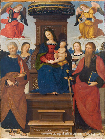 圣母子和圣彼得、亚历山大的圣凯瑟琳、圣阿加塔和圣保罗 卢多维科•迪安吉罗和西尼巴尔多•伊比 1509年 木板蛋彩 佩鲁贾,翁布里亚国家美术馆 这幅作品是意大利贵族家族礼拜堂中传统祭坛画的代表。构图以宝座上的玛利亚和小耶稣为中心,两侧的四位圣徒分别为彼得、亚历山大的凯瑟琳、阿加塔和保罗。构图与佩鲁吉诺和拉斐尔的作品相像。基座上的文字标明完成日期,还有两位画家的签名。他们是从获得这项委托的画家艾乌塞比奥•达•圣乔尔乔处接手这个订单的。 |