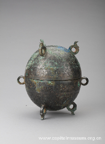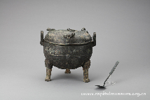 三犀铜鼎(1件套有附件2) 战国 通高23.5厘米,口径21厘米 首都博物馆藏 鼎圆腹,圜底,附耳微外撇,蹄足,盖微隆,中心一环钮,外围三卧犀。腹部装饰蟠螭纹,口沿外侧有秃棱一周,使口部形同子口。盖饰变形的蟠螭纹。 匕,大小、形状和纹饰基本相同。为椭圆形,靠柄处向上翘;直柄,上宽下窄,装饰有兽面纹、勾连云纹。匕与柄合铸一体。 |
