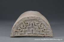 山云纹半瓦当 战国 直径16厘米,残长28.5厘米,高8厘米 通州区潞城镇出土 北京市文物研究所藏 瓦当置于大型建筑的顶部。山云纹瓦当的当面以两道山形纹示重峰,山峰两边各填两条小卷云纹。这种器物流行于春秋晚期至战国中期的燕国统治区内。 |