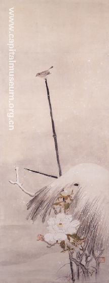 一年十二月图 十一月之寒牡丹 江户时代(1603—1867) 长128.4厘米;宽49.9厘米 东京都江户东京博物馆藏 画家在一年十二个月中的每个月选择一个适合的绘画主题进行创作,全年一共十二幅画作。这幅作品表现的是一年当中的第11个月份,并以在夏冬两季开花的牡丹作为主题。为了抵御大雪和寒冷,冬季开花的牡丹那像草帽一样的花形被画家表现了出来。长谷川雪旦是江户后期的画家,他不拘泥于流派,荟萃各种绘画风格于一身,其素描的功底也很出类拔萃,并以为江户地志杂志《江户名胜图绘》创作插图而享誉画坛。 |