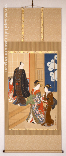 吉原游女图(丁子屋) 1789—1817年 长128.3厘米;宽83.8厘米 东京都江户东京博物馆藏 新吉原是浅草地区北部整饬出来的被幕府承认的花街柳巷,在那里工作的青楼女子没有自由、境遇悲惨,但她们独特的美丽和时尚却是浮世绘画家经常采用的绘画主题。这一作品以坐落在新吉原的老字号“丁子屋”为背景,对男客人、青楼女子以及刚刚踏入青楼的少女进行了形象的描绘。 |