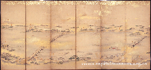 隅田川景物屏风(6扇1对)(局部) 1826年 两扇屏风均长361.2厘米;宽166.7厘米 鸟文斋荣之/绘 东京都江户东京博物馆藏 该屏风描绘了流经江户城的具有代表性的河流 ——隅田川的景色。屏风右翼展示的是河流入海的河口处;左翼描绘的是从此河口处顺流而上,经两国到浅草寺再到待乳山周边。屏风记录下隅田川沿岸的名胜,还附带有标注出该名胜名称的小牌,是一幅体现各风景区的全景图。该作品非常珍贵,不可多得。 |
