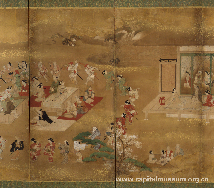 贵族府邸内外游乐图屏风(局部) 江户时代(1603—1867) 长272.4厘米;宽94.2厘米 东京都江户东京博物馆藏 这幅画描绘了人们春天赏花聚会的场景。画中弯曲的膝盖和腰肢展现了女性柔韧的身姿,是典型的菱川派画法。浮世绘绘画发展初期的作品主要是对近代早期对都市平民的日常生活及玩耍嬉戏场面的展现。绘画风格从早期的对形式各异的场景、众多的人物和大型画面的描绘,发展转变为后来的对特定场景、为数不多的人物和小型画面的描绘。 |