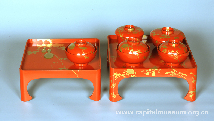 草花折枝果实泥金餐具(丝瓜图食案两个) 1825年 底层主食台长33.5厘米;宽33.5厘米;高13.5厘米 二层副食台长31厘米;宽31厘米;高13厘米 东京都江户东京博物馆藏 这是漆器大师浅野友七制作的红漆碗碟。这套为婚礼定做的、可供20人使用的餐具施以大红地泥金彩,绘有花草水果等图案,并以喜庆的祝福语作为装饰,集中体现出江户文化华美的特点。据推测,该套餐具应该是有渊源的家族使用过的物品。 |