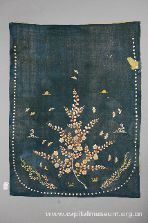 蓝罗绣梅花蜂蝶卷草纹巾 长65厘米、宽50厘米 辽庆州释迦佛舍利塔出土 巴林右旗博物馆藏 图案中心为一梅独放,枝干下白上红,有14朵五瓣梅花,其余均作花蕾状。大干铺锈,小枝锁绣,两边有花草两簇,14只蜂蝶围绕树边。远方有或蓝或黄云状山四处,左右下方由白色联珠圈勾。 |