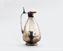 波斯玻璃瓶 朝阳北塔天宫出土 高16、腹围8.3、底径5.7厘米 朝阳北塔博物馆藏 圈足,弧形腹,细颈,口似鸟首,上安子母口式金盖,柄上立短柱, 似鸟尾,整体造型如一只昂首蹲坐之鸟。瓶内立一长颈弧腹小瓶。此瓶呈淡绿色,极轻薄,晶莹透明,而且造型奇特,是产于古代波斯地区的玻璃器珍品。 |