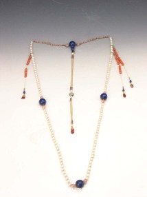 东珠朝珠 此串朝珠按清代定式制造,共由108颗珍珠组成,另有青金石佛头四颗。朝珠后部佛头之下缀以猫眼石背云,下部为红宝石大坠角。朝珠左右侧共由三串珊瑚小珠组成“纪捻”,其下为红宝石小坠角。佩戴朝珠有严格的等级制度规定,以东珠朝珠最为尊贵。 皇帝在不同场合要佩戴不同的朝珠。典礼时要佩戴东珠朝珠;祭天时要佩戴青金石朝珠;祭地时要佩戴蜜蜡或琥珀朝珠;祭日时用珊瑚朝珠,祭月时用绿松石朝珠。 |