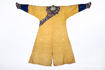 皇太极御用黄色团龙纹常服袍 这件袍服的形制属于满人传统的服装样式,与入关之后的宫廷服饰有较大不同。袍服由黄色锦缎制成,缎面绣有暗团龙纹和云纹等图案,领口、开襟和箭袖部分则以织锦云龙纹装饰。袍服袖前端为箭袖(俗称“马蹄袖”)设计,平时翻起以便活动,冷天翻下盖在手背即可保暖,体现了满族的骑射特色。袍内里加有薄棉用以御寒。 |