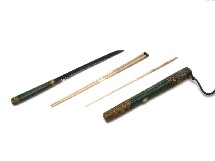 灰绿鲨鱼皮鞘骨箸解食刀 此套刀具由铁、骨、鲨鱼皮、木、铜等材质制成,共分为刀、箸、签、刀鞘四部分。刀为铁质,刀鞘及刀柄为木质,外包灰绿色鲨鱼皮,箸、签均为骨质。
