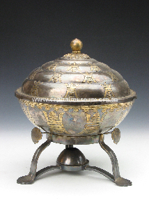 银镀金寿字火碗 此套火碗由盖、碗、底架和火托四部分组成。碗盖顶部饰以镀金宝珠,盖身和碗身均满饰金色寿字;碗底为三足如意形支架,架底部中央为放置酒精的托盘,点燃后可为火碗保温。这件火碗做工精致、寓意吉祥,或专为宫廷寿宴所制,是清宫典型的膳食器皿之一。 |