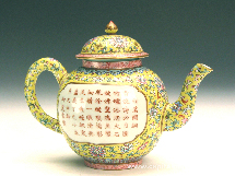 嘉庆款粉彩黄地开光御制诗茶壶 此茶壶壶盖顶纽设计巧妙,呈绽开的鲜花形状,正中顶尖为花蕊;盖面为明黄色地,绘四朵粉彩番莲花,间饰以四个金色“卍”字形纹;壶盖沿、口部和足部均绘粉红勾莲纹,间饰以淡蓝色小花;口沿下为如意云头纹;壶腹左右两侧为海棠形开光,内以楷书写有嘉庆皇帝御制五言诗;开光以外壶身、壶柄、弯流处均绘粉彩番莲纹饰;器内挂苹果绿釉,壶底亦施绿釉,中央朱色篆书“大清嘉庆年制”六字三行款。 |