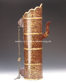 褐漆描金勾莲纹多穆壶 此壶为皮胎,通体漆褐色地,以金漆绘缠枝莲花纹饰;壶身由五道金线分割,每层之间均绘有一朵描金莲花;壶顶端为僧帽式造型,盖顶有铜葫芦形纽;壶把为铜链铜珠设计,便于提携。 |