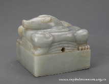 “皇贵妃宝”青玉印 明(1368年—1644年) 长14厘米,宽14厘米,高12.5厘米 印青灰色玉质,蹲龙钮,朱文篆字刻:“皇贵妃宝”。龙钮简笔刻画,口鼻长圆前伸,双目前视,双耳后抿,头顶一绺鬃毛,形似猪首。龙身似蹲似伏,立于云水之间。 |