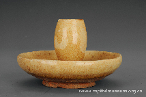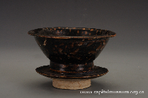 玳瑁斑连托盏 南宋(1127-1276年) 高8.2厘米,口径13厘米,足径5.6厘米 吉安市博物馆藏 此件盏、托为连体,外壁色为天然玳瑁色,别有一番情趣。其做法是在器物上先施一种氧化铁含量较高的釉料,然后再随意甩洒一种氧化铁含量较低的釉料,烧成时产生交融、流淌,千变万化。 |