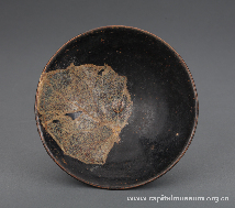 木叶贴花碗 宋(960-1276年) 高5.5厘米,口径14.8厘米,足径3.8厘米 江西省博物馆藏 此碗为饮茶器具。以木叶纹装饰,木叶贴花是一种仅见于吉州窑黑釉茶盏的装饰工艺。其具体方式是将桑叶浸泡加工后,贴在已施加郭黑釉的坯胎上,施黄釉颈高温一次烧成。由于桑叶中的五氧化二磷焙烧时,会与铁釉不融合,产生分离,黑釉上便显现出叶脉清晰的图案。木叶贴花装饰追求天人合一,符合禅宗“无所矫饰,浑然天成”的最高境界。自然之美与人工之美在这里得到了完美结合。 |