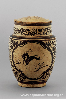 釉下彩绘跃鹿纹盖罐 南宋(1127-1276年) 口径10.4厘米,底径7.8厘米,通高19厘米 1970年江西省南昌县罗家集南宋嘉定二年(1209年)陈氏墓出土 江西省博物馆藏 宋代的跃鹿纹是吉州窑富有个性和时代特色的装饰纹样,以釉下彩绘的方式出现,不见于同时期其他窑口。小鹿双目圆睁,双耳竖起,口衔瑞草,四肢瘦小,身躯紧缩,弓身翘尾。工匠抓住了小鹿腾空跃起瞬间的动态,生动地刻画出小鹿在奔跑状态中保持的机警特性,显得简洁传神,活泼可爱。 整器图案主题突出,反映富贵吉祥,憧憬美满幸福。图案章法匀称和谐,自然完美,给人以清爽轻巧的感觉。 |