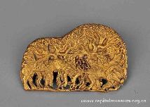 狼噬牛金牌饰 汉代 长15厘米,宽9.5厘米 海北藏族自治州祁连县出土 青海省博物馆藏 画面透雕出山峦、森林、狼、牛等自然形态:森林中一只狼正咬噬住一头牛的后腿,而牛作痛苦挣扎状,画面线条流动,动感极强,使得整个场景充满了自然界弱肉强食的紧张氛围。金牌背部略平展,有两个矩形横扣,应为系挂之用。金牌饰是我国北方多以动物为题材的典型饰物,是显示身份等级的匈奴文化标志性佩物。 |