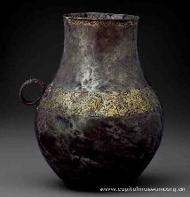 银壶 东汉 高16.2厘米,口径7厘米 西宁市大通县上孙家寨汉晋墓出土 国家博物馆藏 口、腹、底部饰三组错金纹,腹部饰六朵不同形状的花朵。此为希腊化帕提亚装饰风格的银壶,器物的制作工艺和装饰风格沿东西方的商贸路线向东传播而来,其器形应是为了适合其间某个民族或使用者的习惯而作了相应的改制,器物的主人可能是匈奴别部卢水胡。 |