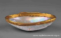 金扣蚌壳羽觞 十六国时期 长13.7厘米,宽10.4厘米,高3.5厘米 西宁市南滩砖瓦厂十六国时期墓葬出土 青海省博物馆藏 羽觞也就是耳杯,椭圆形器具,浅腹,平底,两侧有半月形耳,如鸟的双翼,故名“羽觞”,南朝梁元帝萧绎在《采莲赋》中吟道:“鹢首徐回,兼传羽杯”。盛行于战国到魏晋时期,为日常生活用具,多以木胎作器,也有铜质耳杯,蚌壳镶金口的耳杯极为罕见。 |