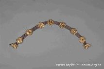鎏金西方神祗人物连珠饰银腰带(丝路) 唐代 通长95厘米,宽3.3厘米,厚0.4厘米,牌饰直径6.5厘米 青海省博物馆藏 腰带用银丝编织而成,呈长条形,上饰有七块圆形包银牌饰,牌饰上铸压出西方神祗人物图案。连珠纹是由大小相同的圆圈或者圆珠连续排列而成的一种装饰图案,盛行于萨珊时期的波斯。唐盛时期,传统的连珠纹样形式特点随着“丝绸之路”的开放被打上了新的文明领地的审美烙印,连珠装饰成为唐代非常盛行的装饰艺术元素。金牌腰带以7个圆形连珠纹牌饰和两个方形连珠纹牌饰组成主题装饰风格,正是这一时期传统图案吸收外来文化艺术营养的结果。 |