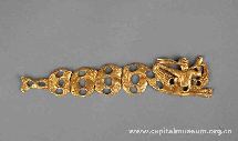 人身鱼尾金饰片(一套3件) 唐 高4.2厘米,厚0.03厘米 海西蒙古族藏族自治州都兰县热水墓群出土 饰片轻薄,花纹錾刻而成。整体呈长条形,前宽后窄,周缘有钉孔。前端为人物形象,束发额带,后飘绶带,翻领袍服,右持来通,左抓羽尾,身带双翼,下为鸟足,身后为回旋鱼身鱼尾,有鱼鳞纹饰。镂空处原镶嵌有宝石,已脱落。器物可能属于剑鞘的装饰。人身鱼尾形象罕见,带有神话宗教内涵,具有特殊的研究价值。 |