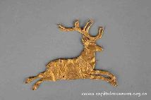奔鹿纹金饰片 唐 长13厘米,高9.2厘米,厚0.04厘米 海西蒙古族藏族自治州都兰县热水墓群出土 饰片轻薄,花纹錾刻而成,周缘有钉孔。鹿的形象雄壮,肌肉突出,策蹄飞奔,枝角硕大,毛发用短线连续錾刻,腹部鱼子为地。器物可能与狩猎人物饰片配合成组,但已失去组合关系。动物细节表现丰富,反映出古人超强的观察力和表现力。 |
