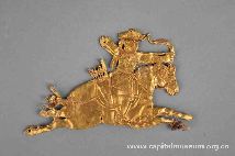 骑射形金饰片 唐 长13.5厘米,高9.8厘米,厚0.04厘米 海西蒙古族藏族自治州都兰县热水墓群出土 此件饰片整体轻薄,周缘有钉孔。武士形象威武,策马飞奔,满弓拉弦,头戴山形冠饰,两根辫子垂于脑后,八字须,大耳坠,窄袖对襟翻领连珠纹图案服饰,革带上佩戴箭箙佩剑,脚着皮靴,马鞍、马镫、马具刻画清晰。都兰郭里木出土的棺板画里即绘有骑射形象。《新唐书•吐蕃传》记载:“其宴大宾客,必驱牦牛,使客自射,乃敢馈”。 |