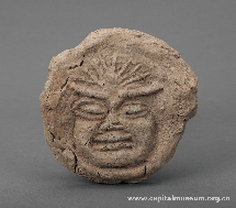 人面纹瓦当 宋 直径14.5厘米,厚1.3~1.8厘米 海东市循化县黑城子遗址出土 青海省文物考古研究所藏 泥质灰陶,手制,脸颊肥硕,圆颌,微露齿,隆鼻,长眼突睛,斜长眉,额头射线状纹饰。虽制作粗糙,但十分生动。 |