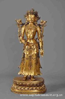 铜鎏金观音像 明代(永乐) 通高146.5厘米,底长63.5厘米,底宽44厘米 青海省博物馆藏 菩萨头戴佛冠,全身饰以璎珞飘带,手持莲枝,袒胸束腰,下部著裙,跣足立于莲花座上。细腰收腹,脐窝深陷,富有弹性,整体姿态呈“S”形,手脚的刻画灵活纤细,有一种女性的柔媚之美。莲座上刻有“大明永乐年施”铭文,整体风格雍容华贵,富丽堂皇,为明代永宣宫廷铸像的典范之作。 |