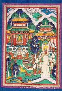 彩绘唐卡释迦牟尼天降图 明代 通长117厘米,通宽68厘米,画芯长65厘米,宽50厘米 青海省博物馆藏 佛传故事是藏传佛教唐卡和壁画中经常表现的题材之一。这组佛传故事唐卡共六幅,分别以绘画的形式表现了释迦牟尼一生重要的故事。这幅唐卡描绘的是释迦牟尼天降的情节,绘画艺人在构图上采用灵活的手法,穿越了程式化的仪轨,在一个平面把发生在不同时间和空间的故事情节加以串连,表现出绘画者的丰富想象力。画中汉式重檐歇山式建筑与藏式宝顶有机结合,反映出汉藏文化的相互交流。 |