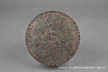 白铜八宝曼扎 清代 直径18厘米 青海省博物馆藏 曼扎为藏密的供器之一,曼扎为“坛城”的意思。曼扎盘即以世间一切珍贵,包括日月四大洲,结成坛城,用以供养诸佛。曼扎盘将各种供品形象化,铸成器物,置于盘上。一般多为中空的环状,以银、铜等薄皮缳刻而成,非常精细,上面镶嵌珠宝,也有用金属丝串珍珠连缀而成,并编织成各色图案,依层往上收敛,形成塔形。修法时,一面诵念,一面往曼扎盘撒上碎石珍宝,撒满底层后再放一层,依次将最后一层放上,象征着祈愿吉祥幸福,将法界供养给诸佛菩萨本尊。此件为银质,正面錾刻精美花纹,中间为坛城,四周环绕藏八宝,边缘为海水和山峦纹样,工艺精湛。 |