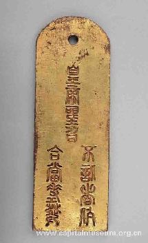 金牌信符 明代 通高23.6厘米,宽8.1厘米,厚0.7厘米 传世品 青海省贵德县博物馆藏 紫铜描金,长方形,顶部半圆形,正面铸楷书“信符”二字,背铸篆书 “皇帝圣旨”4字,下部为“合当差发,不信者斩”8字。骑缝处有“十五号”字样。这种编号“拾伍”的金牌信符,就是当年下发给必里卫21面金牌中的一面。此信符为明代以茶易马的专用凭证。 洪武初年,开茶马互市后,私茶严重,朱元璋下令严其制,酷其刑。据《明会典》记载,明王朝共制作金牌信符共41面,下发沙洮州、河州、西宁州各部族,其中河州必里卫西蕃29族21面。每三年遣官一次合符,以茶易马。此制至永乐十四年(1416年)因茶禁松弛,曾一度停止;宣德十年(1435年)又恢复,明英宗正统末(1449年)始“罢金牌”。 “以茶驭番”策略的运用,以推行“金牌差马”制最为典型。金牌差马又称差发马,是皇帝对臣民的“差发”,为西北、西南藏区僧俗首领族所持有、按期为明廷交纳马匹的凭证。 |