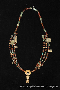 玛瑙、绿松石、玉石组配 西周(前1046-前771) 房山区琉璃河西周燕国墓地出土 首都博物馆藏 玛瑙、绿松石、玉石组配由110件大小不一的玛瑙、48件绿松石、21件形态各异的玉饰组成,佩戴于颈间,是贵族阶层的身份象征。 |