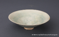 景德镇窑青白釉月映梅纹碗 高3.7cm,口径13cm 元(1206-1368) 海淀区颐和园内耶律铸夫妇墓出土 首都博物馆藏 宋元时期文人善咏梅,诗词中常有月、梅共同出现的诗句,以衬托梅花高洁闲静的品格,月梅纹也成为这一时期独特的装饰题材。此件器物中心饰月梅图案,外围有一周回纹印花,敞口、斜壁、平足,胎质洁白细腻,釉色白中闪淡青,釉厚处呈深绿。 |