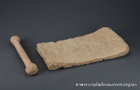 东胡林遗址出土石磨盘、石磨杵(新石器时代) 盘:长53cm,宽30cm,厚5cm,杵:长38cm,直径6cm 新石器时代 东胡林遗址出土 永定河文化博物馆藏 东胡林遗址位于门头沟区斋堂镇东胡林村西侧,距今约1万年左右,是新石器时代早期人类遗址。出土有人类化石、石制品、骨制装饰品、夹砂红陶碎片等。东胡林人所处的考古阶段,是新旧石器时代交替时期,填补了自“山顶洞人”之后华北地区人类发展的空白;同时也是冰期向后冰期转变的阶段,是研究环境变化与人类早期文化发展的关系的重要材料。 遗址中成套出土了石磨盘、石磨杵,表面有使用痕迹,其中石磨杵呈棒槌状,两端为球形,中间为圆柱体,制作较为精致。石磨盘、石磨杵的发现,反映了东胡林人当时的生活状况,配合东胡林遗址其他出土物诸如陶器碎片、火塘及粟类植物种子,对研究中国农业起源问题具有重要意义。 |