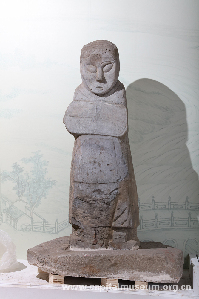 东汉石人 身高150cm,胸廓50cm,座高20cm,最宽110cm,最长80cm 东汉(25-220) 丰台区永定河河床出土 北京石刻艺术博物馆藏 又名“捧盾石人”,石人身着长袍,双手拱于胸前。青石质地,雕刻自然质朴,浑然天成。 |