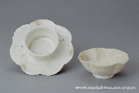 龙泉务窑白釉六瓣盏托 高6.6cm,口径7.6cm 辽(907-1125) 原崇文区永外彭庄出土 首都博物馆藏 龙泉务窑烧制的瓷器与北宋定窑瓷器相似,亦称为“仿定”。盏托是与茶盏配套使用的器具,始见于东晋,盛行于唐宋,各大瓷窑均有烧制。此件白釉六瓣盏托口沿为花瓣形,通体施白釉,造型规整,胎质细腻。 |