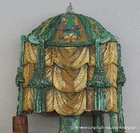 八宝为佛教法器,包括莲花、华盖、法螺、法轮、伞、盘肠、罐、双鱼八种元素。八宝纹饰具有吉祥的寓意,常绘制于明清时期传统工艺品之上。此件琉璃八宝制品烧制于门头沟区龙泉镇琉璃渠村,窑址位于清代琉璃厂宅院南部。元明清时期,琉璃渠窑场长期为皇家园林、陵寝等建筑提供琉璃制品。 |