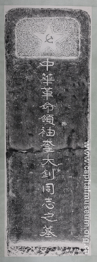 李大钊碑文拓片 长138.6cm,宽49cm 民国(1912-1949) 首都博物馆藏 李大钊牺牲后,灵柩停放在宣武门外妙光阁浙寺。1933年4月,中共河北省委、北平市委举行公葬李大钊活动,并在万安公墓埋下刻有“中华革命领袖李大钊同志之墓”字样的石碑。 |