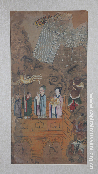 佛牌画 佛牌画:长82cm,宽49cm; 佛牌字:长102cm,宽48cm; 佛牌字(窄条):长127cm,宽27.5cm 清(1644-1912) 门头沟区三家店村龙王庙中发现 永定河文化博物馆藏 1987年修复三家店龙王庙时,在正殿佛龛下发现大量彩绘佛牌字、佛牌画。画以石青、石绿、石黄、朱砂等石色为主要颜料,工笔重彩,用色讲究,构图疏密有致,极富装饰性。 |