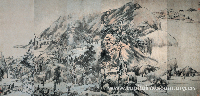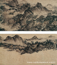 江山胜览图卷 谢时臣 明 嘉靖庚寅九年 (1530) 绢本 设色 纵28厘米 横553.6厘米 上海博物馆藏 谢时臣,生卒年不详,主要活动于万历前后。字思忠,号樗仙,吴县(今江苏苏州)人。善画,能诗,工书法。谢时臣强调绘画文学修养和意趣等画外功夫,技法上兼吴派沈周和浙派戴进、吴伟之长,其画“长卷巨幛,纵横自如”,恢弘大气,却又不失清新秀润。《无声诗史》谓其“颇有胆气……气势有余,韵秀不足”。 款识:嘉靖庚寅,谢时臣画 钤印:虎丘山人 |
