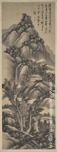 挂壁飞泉图轴 龚贤 清 纸本 墨笔 纵273厘米 横55.2厘米 天津博物馆藏 龚贤(1618—1689年),一名岂贤,字半千,号野遗 、柴丈人等,江苏昆山人。“金陵八家”之一,工诗文,善行草,源自米芾,又不拘古法,自成一体。著有《香草堂集》。 山泉飞泻,白云浮现于山间,茅屋错落,草木葱茏。作者用积墨法一遍遍地皴点山石,笔墨厚重。在用墨浓重的同时,留出受光的部分,黑白对比分明。构图虽满,但并不觉得臃塞。 款识:挂壁飞泉同夜月,月光来处四窗虚。山中满地白云湿,不是楼台不可居。半亩龚贤题。 钤印:龚贤、钟山野老 |