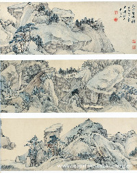 江山卧游图卷 程正揆 清 顺治九年(1652) 纸本 设色 纵26厘米 横305厘米 故宫博物院藏 程正揆 (1604-1676年),字端伯,号鞠陵,又号青溪道人等,湖北孝感人。崇祯四年(公元一六三一年)进士。工书,善画山水,初得董其昌指教,后则自成一家。 画家在北京为官时,因苦于“无山水可玩,无书画可购,无收藏可借”,故绘制前后共五百余卷的《江水卧游图》,借画中山水卧游。此作为其中之一。画家用清硬的线条,写其胸臆之山水,层峦叠嶂,怪石嶙峋,树木萧疏,境界深邃幽奥,格韵高古,自成一家。 |