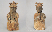 越窑青釉胡人俑/仕女俑 西晋(265-317年) 杭州市萧山区城南乡采集 武士俑高28.9厘米,仕女俑高26.3厘米 杭州市萧山区博物馆藏 武士俑头戴尖顶翻盖帽,帽檐外突,后有系带。武士身着斜襟交领宽袖大袍,右手持环首刀,左手持盾。该俑五官有胡人特征,尖顶帽为胡人风格,但穿着的衣服却是典型的汉人服饰,显示了西晋时期汉胡文化的融合。 仕女俑头挽造型优美、错落有致的装饰状发髻,并用阴线刻出发丝。身着斜襟交领长袍。右手握扇,左手怀抱幼儿。幼儿头挽双髻,左手抱一瓜棱球形物。 两件人俑的身体和头部中空。耳部和帽沿处有对称小孔,应是为了防止焙烧时炸裂而做的出气孔,可见当时越窑技术水平已达到一定高度。西晋瓷俑主要流行于长江中下游地区,制作精细。 |