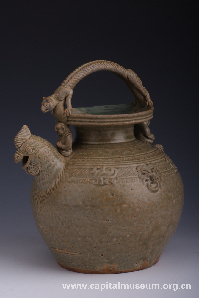 越窑青釉鸡首壶 西晋(265-317年) 1995年余姚市肖东五金墩出土 高23.7厘米,口径11.9厘米,底径12.0厘米 余姚博物馆藏 鸡首壶在三国至隋唐时期的墓葬中大量出现。鸡为阳性,有禳灾除凶之意。应劭(汉)《风俗通义》载,鸡可以“御死辟恶”;又司报时,名“午时鸡”“司夜鸡”,有驱百鬼、祛百病、辟邪恶的厌胜功能。将鸡首壶壶鋬做成黄鼬形较为罕见。黄鼬俗名黄鼠狼,是鸡的天敌,将两者组合在一起,构思妙趣横生。 |