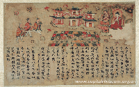 插图本《佛说阿弥陀经》写本 唐(618-907年) 龙泉崇因寺塔出土 纵29厘米,横45.5厘米 浙江省博物馆藏 残片分上下两部分,上为经画,下为经文,内容为《佛说阿弥陀经》正宗分起首部分关于阿弥陀佛国庄严景象的描述。绘画用墨及土红(赭、朱砂、白垩、黄等色,佛、菩萨头光或背光内沿以绿色稍加晕染。“七宝池”与三座二层“宝楼阁”居于画面正中,象征西方极乐世界;一佛二菩萨居右,当为阿弥陀佛与观音、势至的组合;三位阿弥陀佛国土众生居左,当为表现其以衣裓盛花礼敬供养以阿弥陀佛为代表的各方诸佛,希冀来世能进入极乐世界。画周围饰有莲花、百合等折枝花卉。 写本经文部分:朱丝栏,墨书,唐楷,朱笔点读,存26行,行10字。 这是目前唯一所见图文兼具的插图本《佛说阿弥陀经》写本,是研究唐代佛教的重要实物资料。已有学者从绘画内容、绘画语言、写经书风以及佛经版本等方面考证其为唐开元之后盛唐或中唐之作,以中唐可能性为大。 |