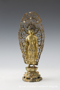 鎏金铜佛立像 南宋绍兴十四年(1144年) 宁波天封塔地宫出土 高28厘米,宽11.5厘米 宁波博物馆藏 此尊造像出土于宁波天封塔地宫,该地宫时代已到南宋,但此造像的造型与韩国出土的统一新罗时期的金铜佛立像非常相似。统一新罗时期佛像深受唐风影响,典型风格是头部呈卵形,着通肩式袈裟,紧贴身体,躯干和两腿的衣纹呈多重水波纹。 此尊立像出现在宁波应与佛教交流、明州港兴起有关。五代吴越国禅教两宗兴盛,五代至南宋数百年间高丽僧人义通、智宗、义天、坦然等相继入两浙求法,往还多经过明州。北宋为了抗击辽国,推行“联丽制辽”的外交政策,由于北方先后为辽、金所据,传统通往朝鲜半岛的官方航线受阻,因此,宋神宗熙宁(1068-1077年)以降,明州成为宋与高丽官方往来的唯一合法港口。 |